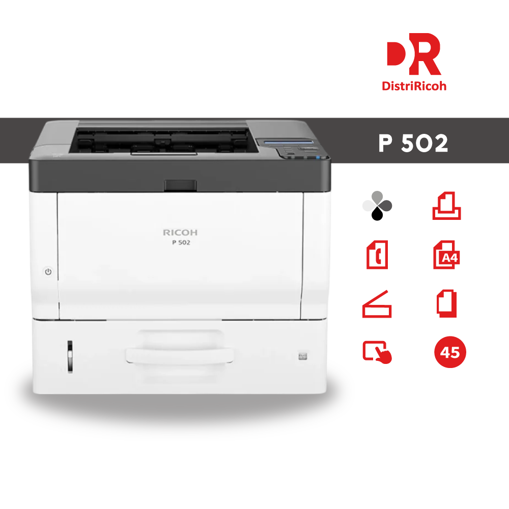 La Ricoh P 502 es una impresora láser monocromática ideal para oficinas pequeñas y medianas que buscan eficiencia y productividad sin elevar costos. Ofrece una alta velocidad de impresión de hasta 42–45 ppm, una resolución de 1200 × 1200 dpi para textos nítidos y un rendimiento confiable gracias a su memoria de 512 MB. Cuenta con una bandeja estándar de 250 hojas más una multipropósito de 100 hojas, y puede ampliarse hasta una capacidad máxima de 1.100 a 2.100 hojas, permitiendo atender volúmenes de impresión crecientes sin comprometer el presupuesto.